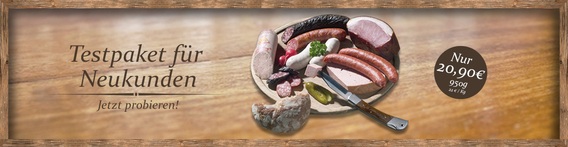 Der Wurst und Fleischversand ist absolute Vertrauenssache. Gerne möchten wir Sie von unseren Bayerischen Spezialitäten überzeugen und bieten allen Neukunden daher ein Testpaket mit ausgewählten Bayerischen Spezialitäten aus unserem Sortiment für nur 17,50 € (950g). Für diesen Spitzenpreis erhalten Sie Weißwürste, Käsekrainer, Bayrischen Leberkäse, Bauernschwarzwurst, Rohpolnische, rohen Schinken und Zwiebelwurst. Außerdem bieten wir für das Testpaket eine Geld-Zurück-Garantie an. Sollten Sie nicht zufrieden sein, bekommen Sie Ihr Geld zurück!