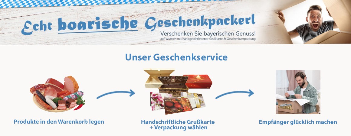 Ich habe bisher 4 Mal bei Ihnen bestellt und war immer sehr zufrieden. Die Waren kommen immer sehr gut bei den Beschenkten an. Mir gefällt besonderst, dass Sie die Glückwunschkarte von Hand schreiben. Ich wünsche mir ein Geschenkpakte mit ausschließlich länger haltbaren Waren, wie zB geräucherte Wurst,
