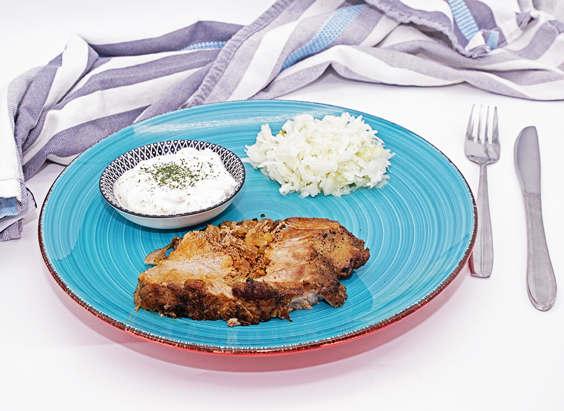 Ein Schweinebraten lässt sich auch anders als immer nur klassisch zubereiten. Wie wäre es mit einem saftigen Gyrosbraten, Tzaziki und Krautsalat?