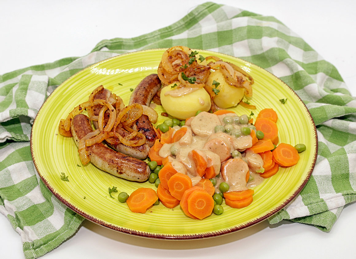 Bratwurst mit Röstzwiebeln, Rahmgemüse und Salzkartoffeln
