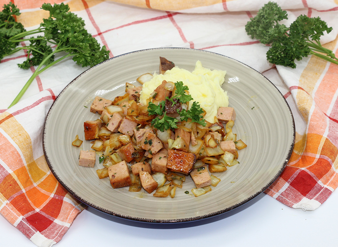 Krautpfanne mit Leberkäs und Kartoffelpüree