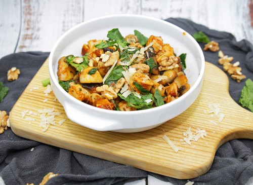 Spinat-Parmesan-Pfanne mit Walnüssen und Gourmet-Bratwurst